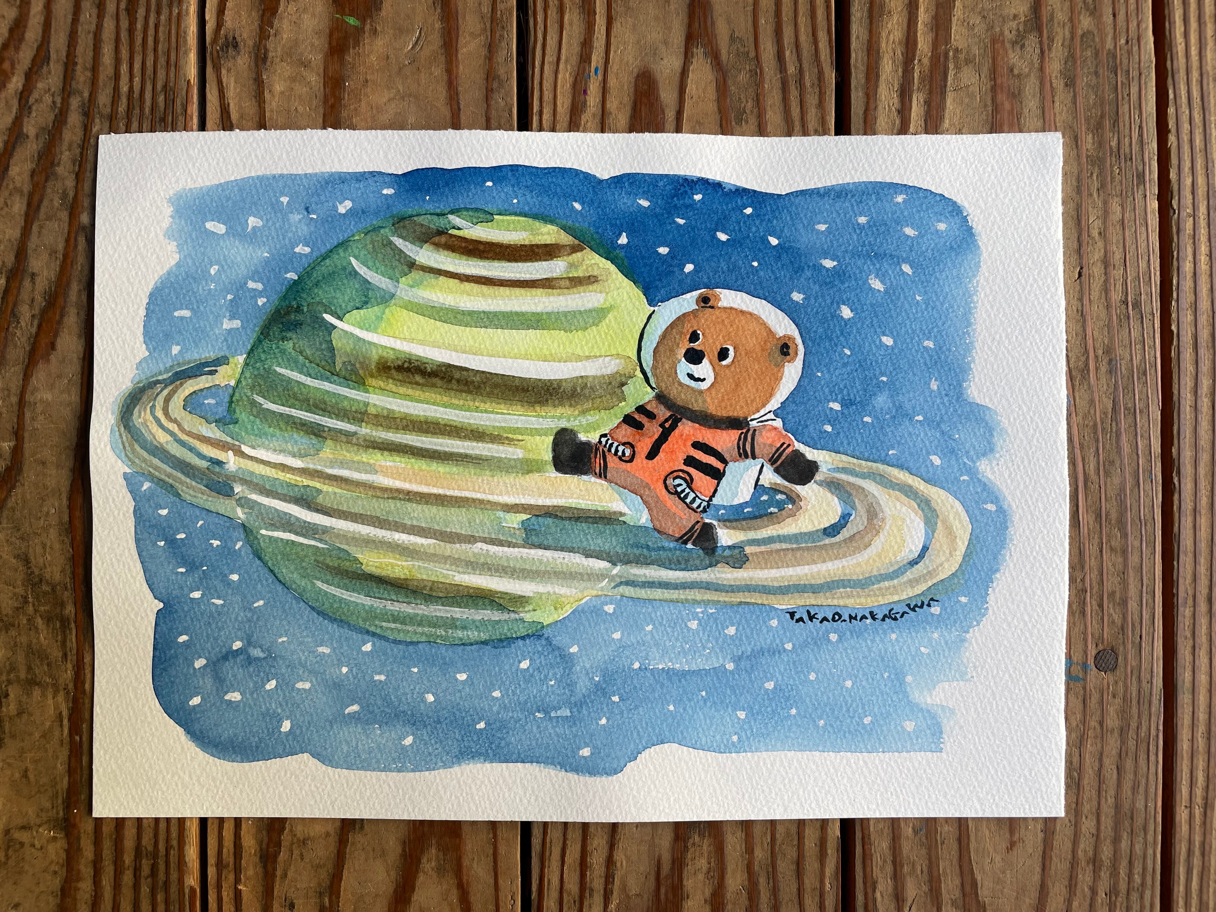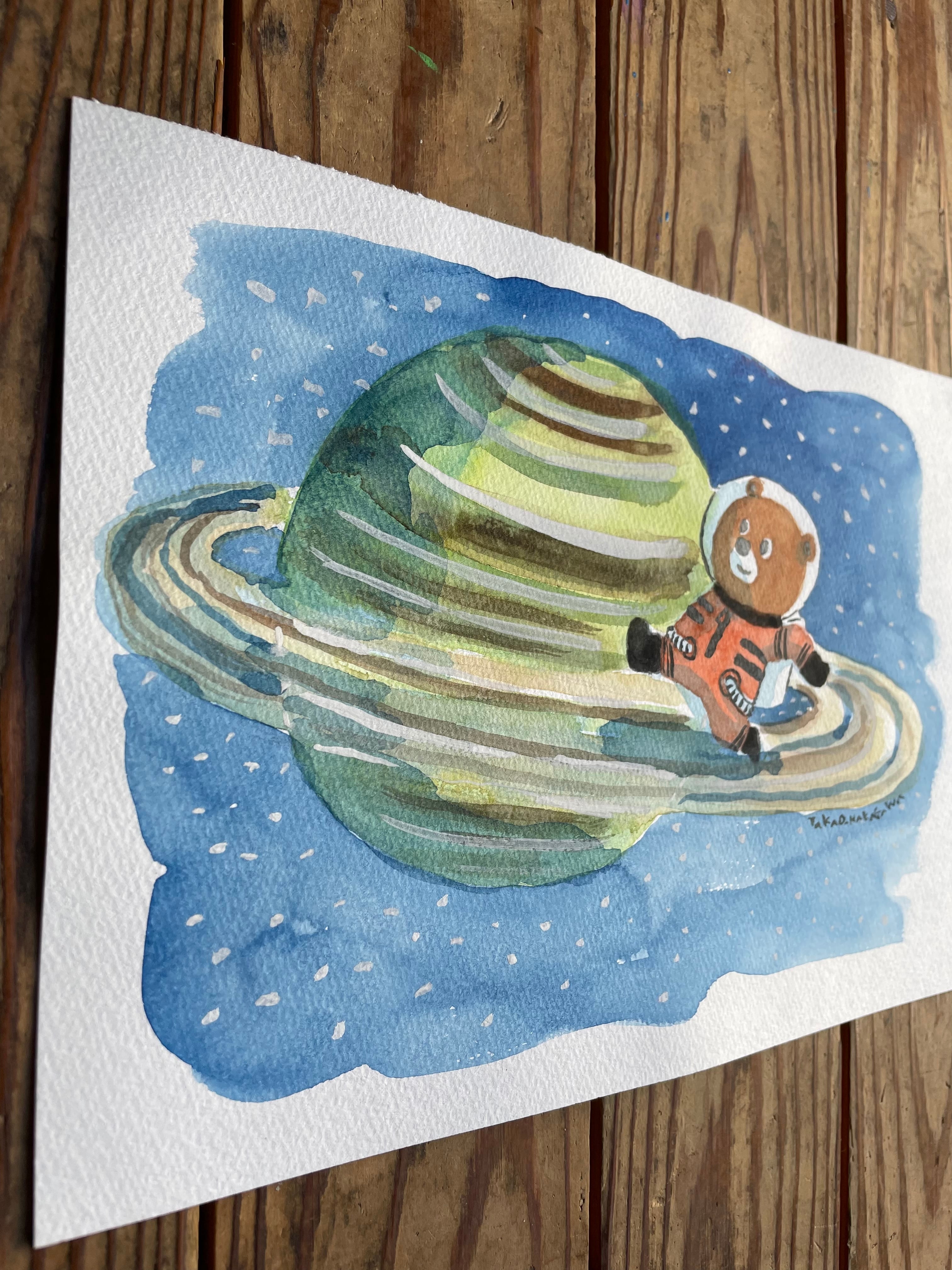 宇宙を旅するクマが惑星の輪っかでジョギングする様子を描きました。