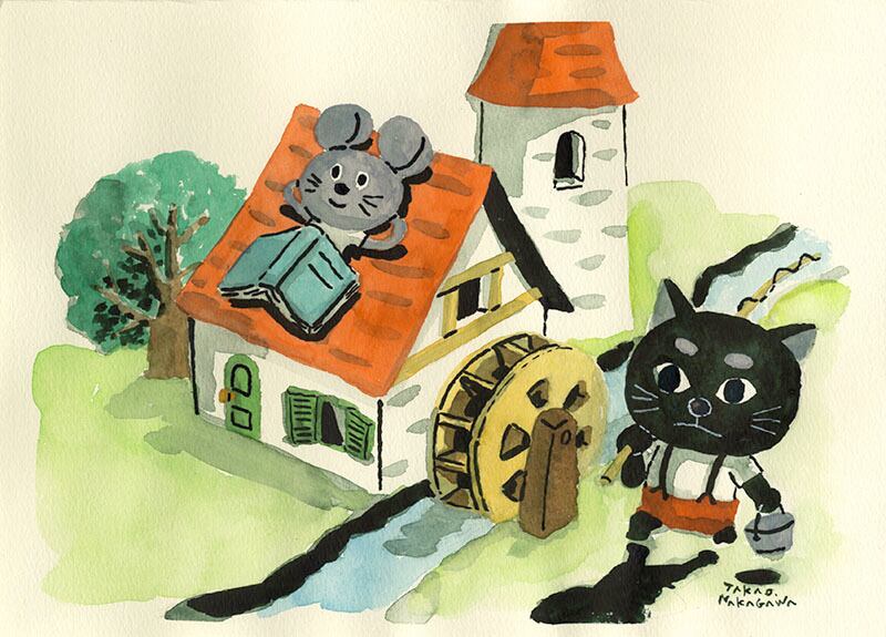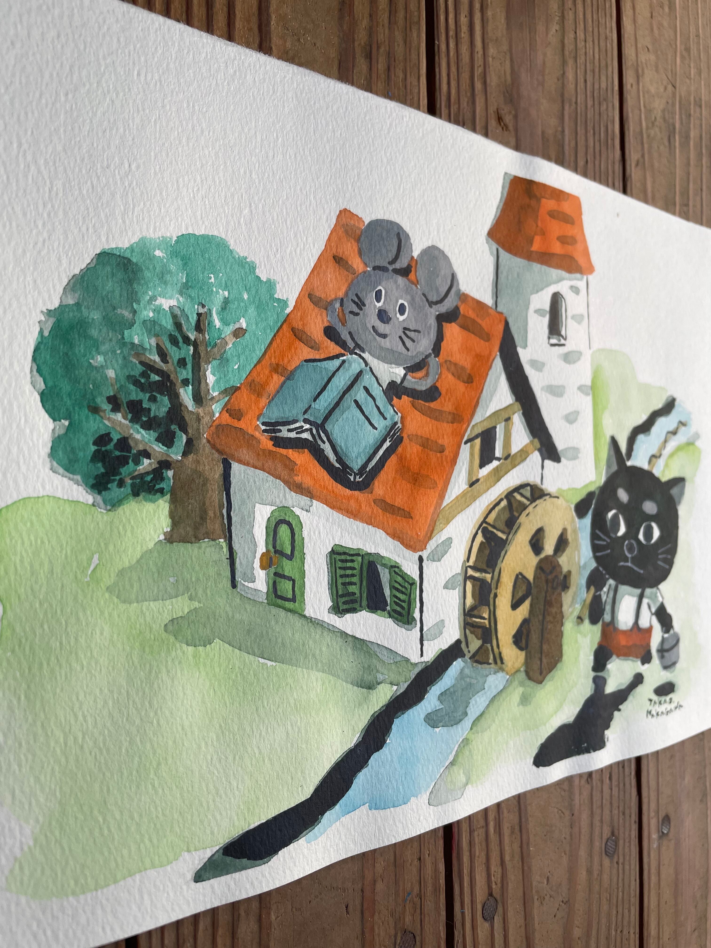 ということでということで、ということで、屋根の上で本を読むネズミと釣りに出かけるネコを描きました。